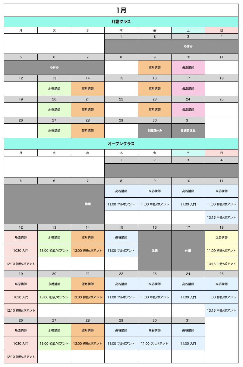 お知らせ - 2025年11月26日 2026年1月クラススケジュール 1月より2件の変更があります。 ▪️新しく長島講師をお招きします。土曜日 ジュニア Cクラスを担当して頂きます。 ▪️土曜日11時からの入門クラスは永橋講師から高谷講師に変更になります。 以上、確認お願い致します。