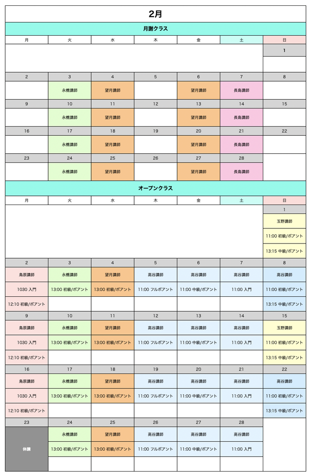 2026年2月クラススケジュール